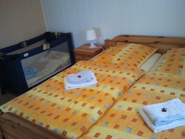 Ihre Nachtruhe verbringen Sie im Elternschlafzimmer, in dem auch ein Beistellbett für ein Kleinkind aufgestellt ist.